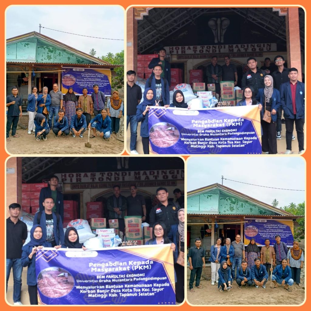 Pengabdian kepada Masyarakat Menyalurkan Bantuan Kemanusiaan Kepada Korban Banjir Bandang Desa Kota Tua Kecamatan Sayurmatinggi Kabupaten Tapanuli Selatan oleh Mahasiswa bersama BEM Fakultas Ekonomi Universitas Graha Nusantara Padangsidimpuan