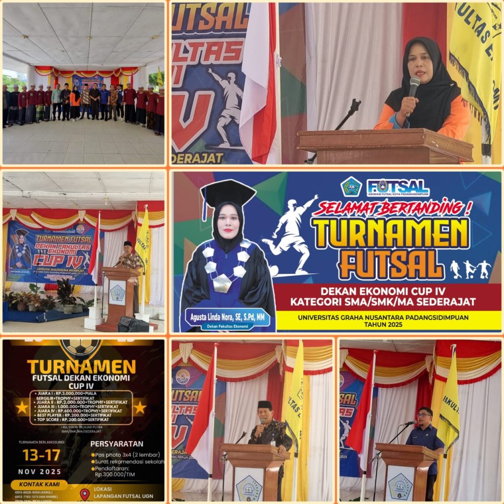Pembukaan Turnamen Futsal Dekan Fakultas Ekonomi CUP ke IV bekerjasama dengan Asosiasi Futsal Kota Padangsidimpuan (AFKOT), secara resmi dibuka oleh Dekan Fakultas Ekonomi UGNP, Kamis tgl. 13 Nopember 2025 bertempat di Aula Kampus 2 Fakultas Ekonomi. Turnamen Futsal Dekan Fakultas Ekonomi UGNP sudah berjalan selama empat tahun, dalam rangka menjadikan remaja lebih terarah dan gemar berolah raga agar terhindar dari narkoba dan kejahatan, demikian disampaikan Dekan Fakultas Ekonomi Ibu Agustalinda Nora, S.E., S.Pd., M.M pada Pembukaan turnamen. Diikuti 43 Tim Futsal SMA/SMK/Ponpes se Tabagsel swasta maupun negeri, berlangsung dari tgl. 13 – 17 Nopember 2025 di Lapangan Futsal Batalyon 123 Rajawali. Hadir dalam acara pembukaan Turnamen Futsal, Ketua Yayasan UGNP (YADPI) Drs. H. Marasaud Harahap, Rektor UGNP Dr. Drs. Burhanuddin, M.Pd, Kacabdis Wil XI Padangsidimpuan, Ketua AFKOT Padangsidimpuan, Mewakili dosen senior Dr. Drs. Ngelem Ginting, M.M, para Wakil Rektor 1,2 dan 3 UGNP, Dekan Fakultas Pertanian Dr. Angelia Utari, S.Pt., M.P, seluruh Fungsionaris Fakultas Ekonomi, seluruh Tim Futsal serta para guru guru pembimbing. Dalam kesempatan tersebut pihak Panitia Pelaksana Turnamen Ketua Panitia Asrul Majid bersama AFKOT melaksanakan Technical Meeting untuk menjelaskan sistem turnamen dan penyusunan jadwal pertandingan.